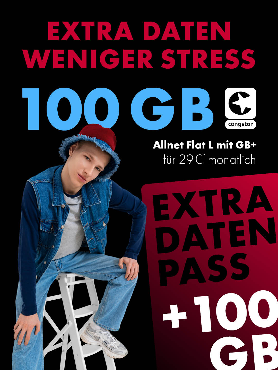 * Aktion für Neukunden bei Buchung bis zum 26.05.2026: Die congstar Allnet Flat L mit GB+ kostet monatlich 29 €. Mindestvertragslaufzeit 24 Monate. Einmaliger Bereitstellungspreis 15 €. Die Bandbreite wird ab einem Datenvolumen von 100 GB statt 20 GB im jeweiligen Monat von max. 50 Mbit/s im Download und 25 Mbit/s im Upload auf max. 32 Kbit/s im Download und Upload beschränkt. Voraussetzung für das Surfen im 5G-Netz ist die Verfügbarkeit von 5G am Standort und ein 5G-fähiges Endgerät. Sofern 5G am jeweiligen Standort nicht verfügbar ist, surfst Du mit EDGE / LTE. GB+: Das monatliche Datenvolumen erhöht sich im Tarif Allnet Flat L alle 12 Monate um jeweils 10 GB. Bei Tarifwechsel in einen anderen Tarif gelten die Konditionen des neuen Tarifes. Extra Datenpass: Der Extra Datenpass ist einmal pro Monat ab einem Verbrauch von 80% des Inklusivdatenvolumens für 0 € aktivierbar, um das Inklusivdatenvolumen deines Tarifs erneut hinzuzubuchen. Dieses ist sofort bis zum jeweiligen Monatsende mit der vereinbarten Übertragungsgeschwindigkeit nutzbar. Nicht genutztes Datenvolumen verfällt danach. Nach Verbrauch deines Gesamtdatenvolumens, bestehend aus Datenpass und Inklusivdatenvolumen, wird die Bandbreite auf max. 32 Kbit/s im Down- und Upload beschränkt. Vertragspartner der Mobilfunkdienstleistung: congstar – eine Marke der Telekom Deutschland GmbH, Bayenwerft 12–14, 50678 Köln.
