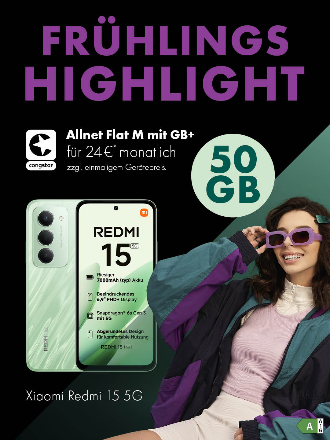 * Aktion für Neukunden bei Buchung bis zum 26.05.2026: Die congstar Allnet Flat M mit GB+ kostet monatlich 24 €. Mindestvertragslaufzeit 24 Monate. Einmaliger Bereitstellungspreis 15 €. Die Bandbreite wird ab einem Datenvolumen von 50 GB statt 15 GB im jeweiligen Monat von max. 50 Mbit/s im Download und 25 Mbit/s im Upload auf max. 32 Kbit/s im Download und Upload beschränkt. Voraussetzung für das Surfen im 5G-Netz ist die Verfügbarkeit von 5G am Standort und ein 5G-fähiges Endgerät. Sofern 5G am jeweiligen Standort nicht verfügbar ist, surfst Du mit EDGE/LTE. GB+: Das monatliche Datenvolumen erhöht sich im Tarif Allnet Flat M alle 12 Monate um jeweils 5 GB. Bei Tarifwechsel in einen anderen Tarif gelten die Konditionen des neuen Tarifes. Für jedes Vertragsjahr im bisherigen Tarif erhält der Kunde das GB+ Volumen, welches für den neuen Tarif gilt. Das heißt: GB+ Volumen pro Vertragsjahr im bisherigen Tarif bei Wechsel in die Allnet Flat XS 1 GB, bei Wechsel in die Allnet Flat S 2 GB und bei Wechsel in die Allnet Flat L 10 GB. Vertragspartner der Mobilfunkdienstleistung: congstar – eine Marke der Telekom Deutschland GmbH, Bayenwerft 12–14, 50678 Köln.
